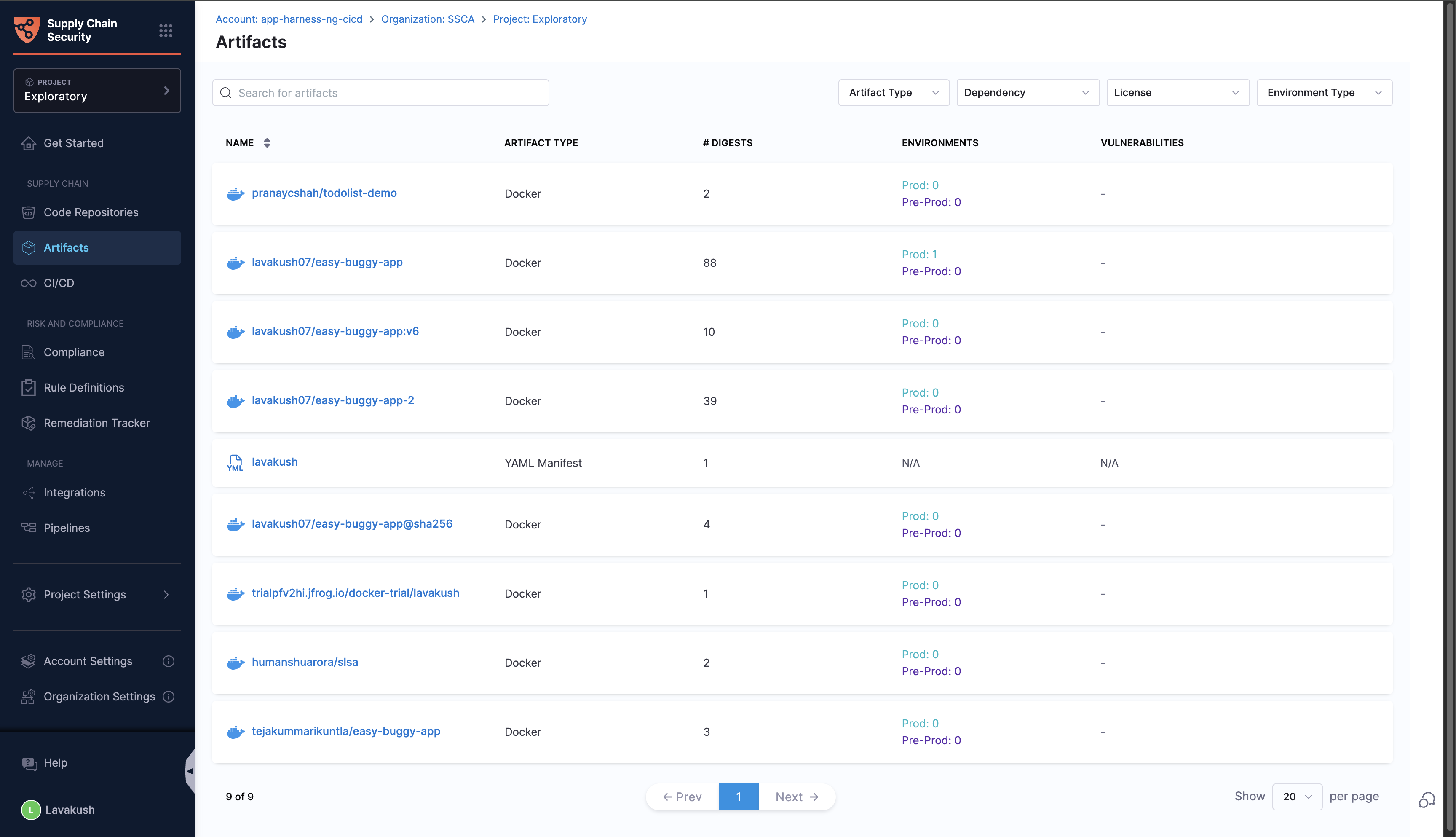Any artifacts that go through SBOM Orchestration, SBOM Policy Enforcement, or SLSA Provenance will be listed here. Additionally, the Artifacts section integrates with the Harness CD (Continuous Deployment) and STO (Security Testing Orchestration) modules, providing details linked to deployments and security scanning results for images.