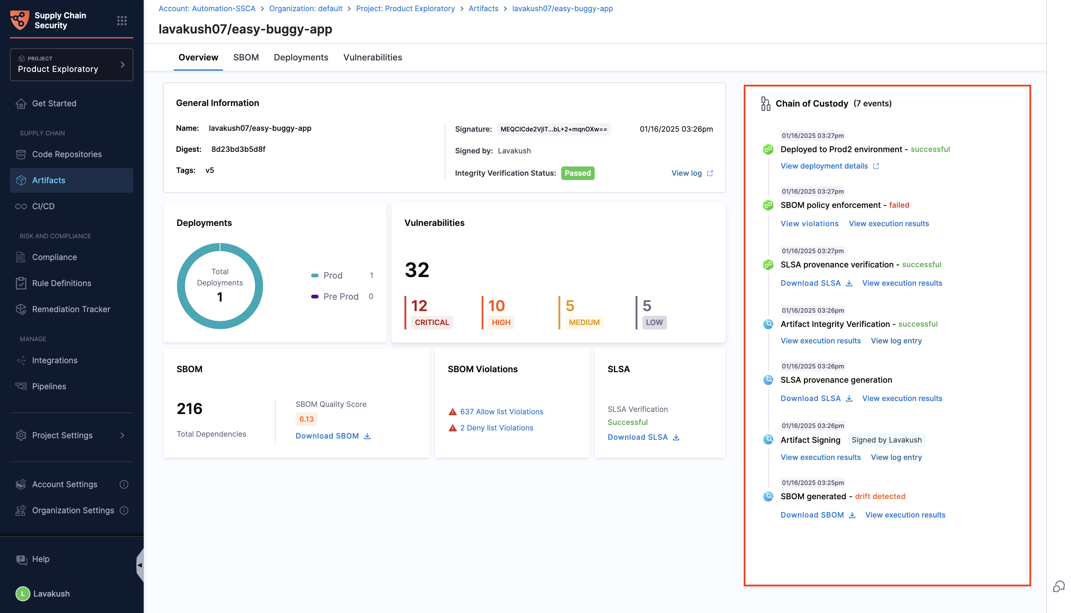 - SLSA Provenance: View the provenance and verification status of artifacts following the SLSA framework.